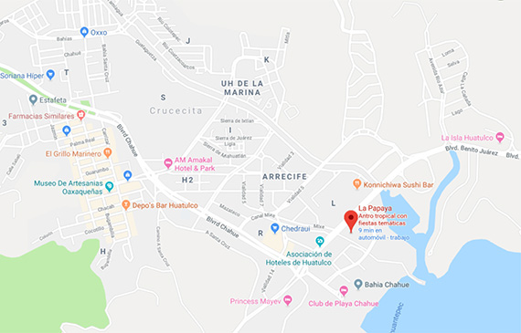 La Papaya Huatulco se encuentra sobre el Andador de la Fiesta y a unos pasos de la bahía Chahué. Si deseas saber como llegar solo hass clic en este enlace (Ir a La Papaya) y conoce el mejor antro de Huatulco.